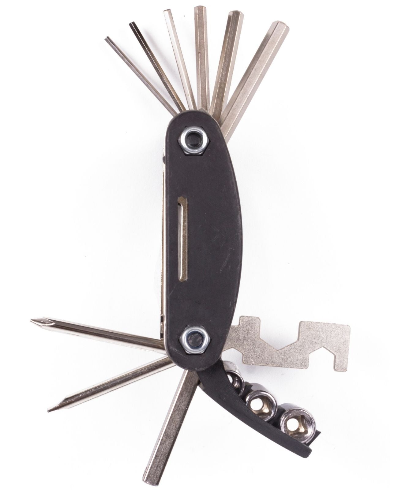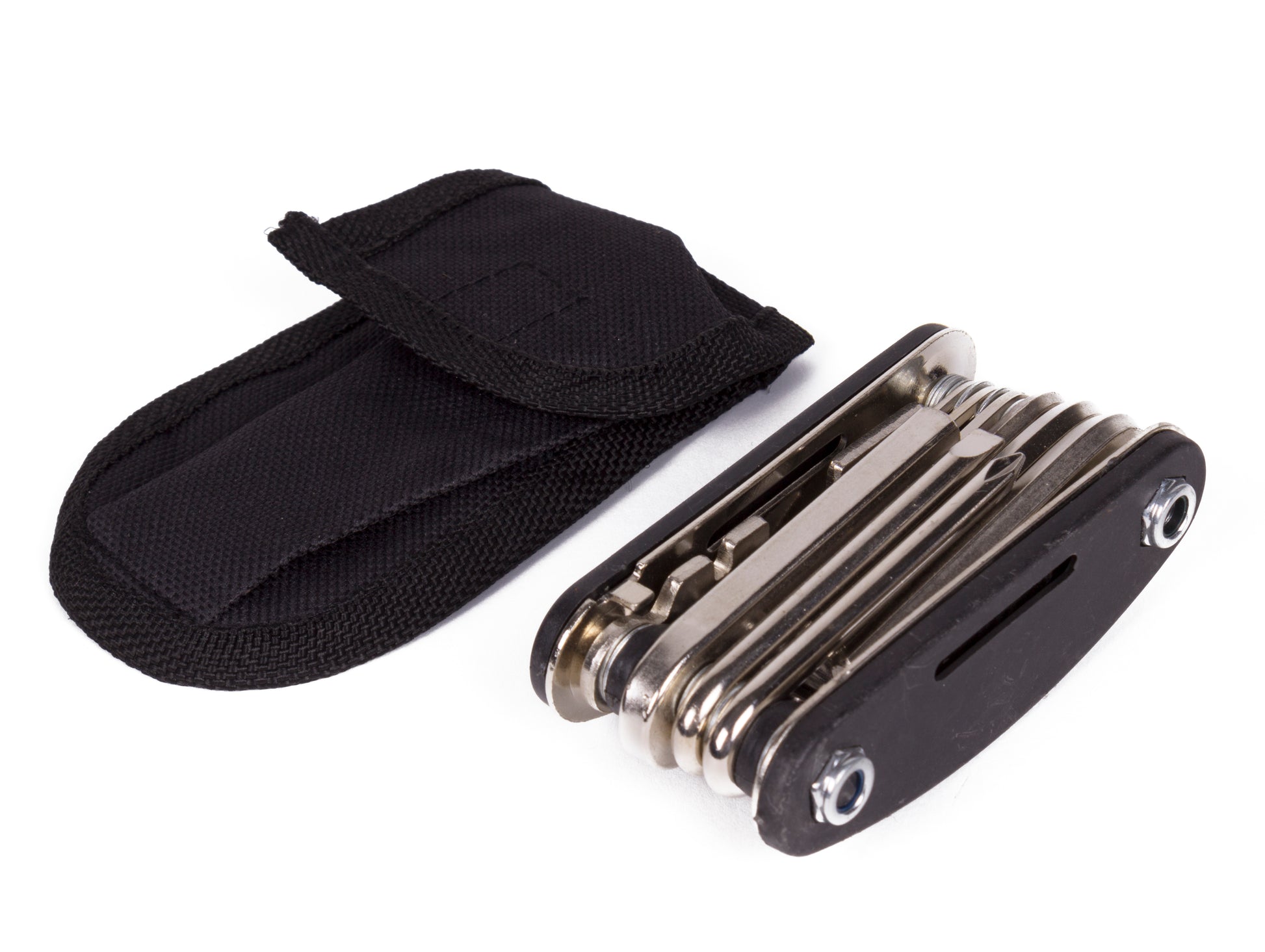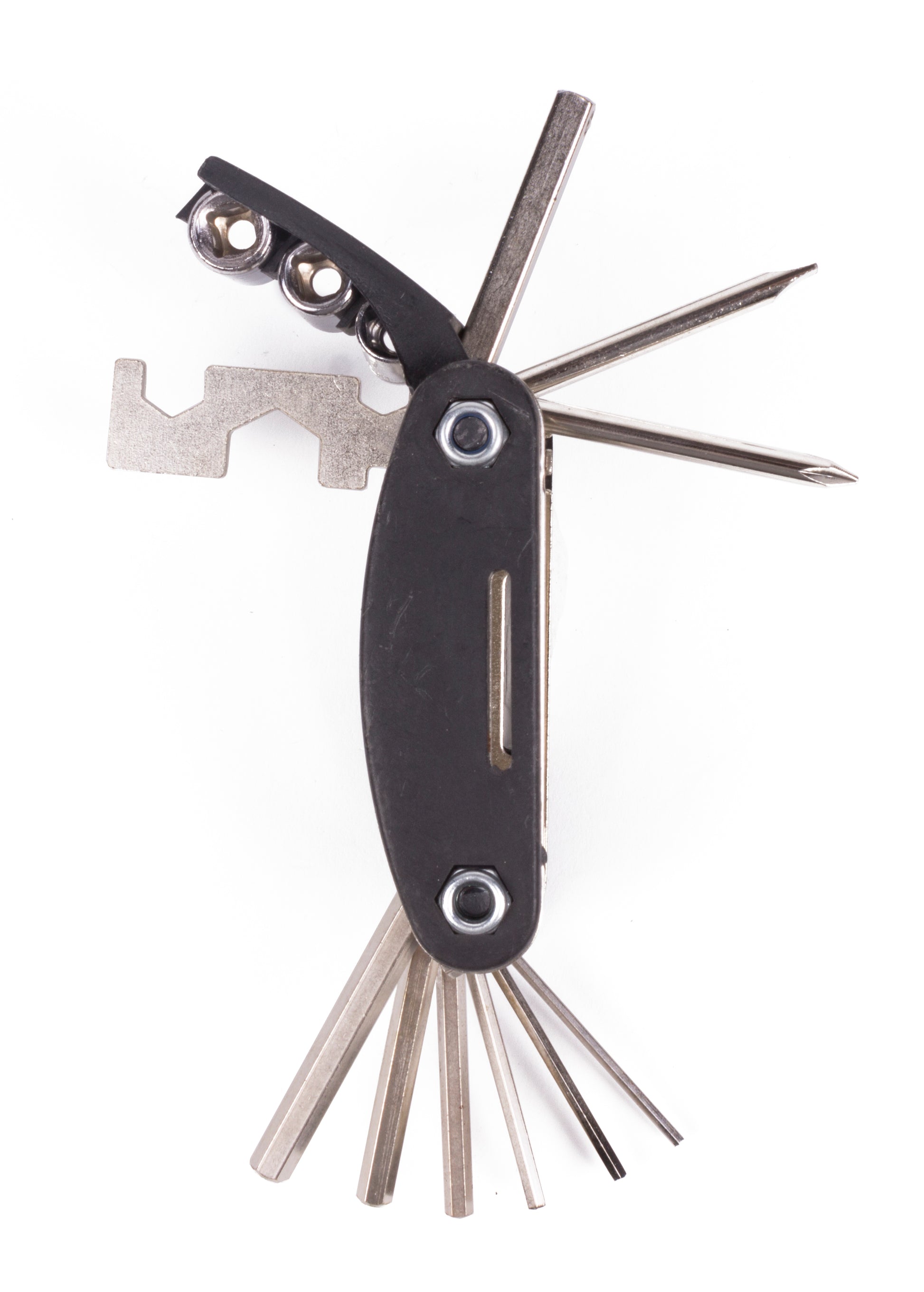 Im Set enthalten sind unter anderem Steck- und Schraubenschlüssel in den wichtigsten Größen, Schlitz- und Kreuzschlitzschraubendreher, ein 14GE-Speichenschlüssel sowie sechs Innensechskantschlüssel von 2 bis 6 mm. Alles ist durchdacht zusammengestellt, damit du kleine Probleme sofort selbst lösen kannst.