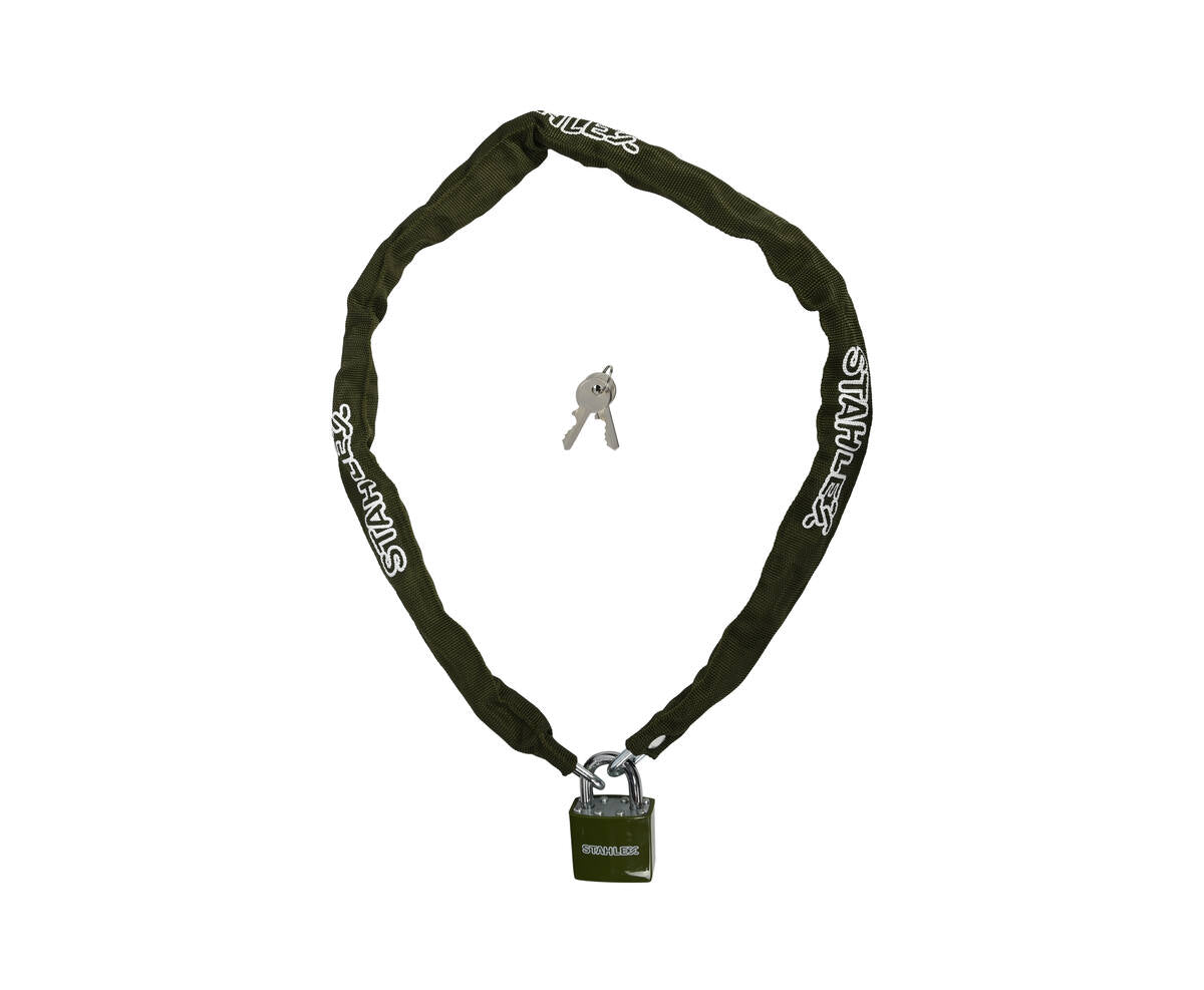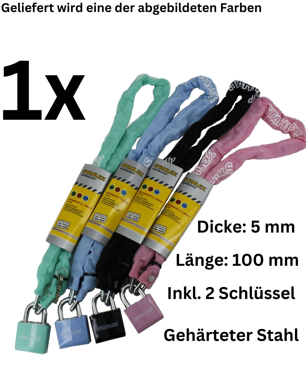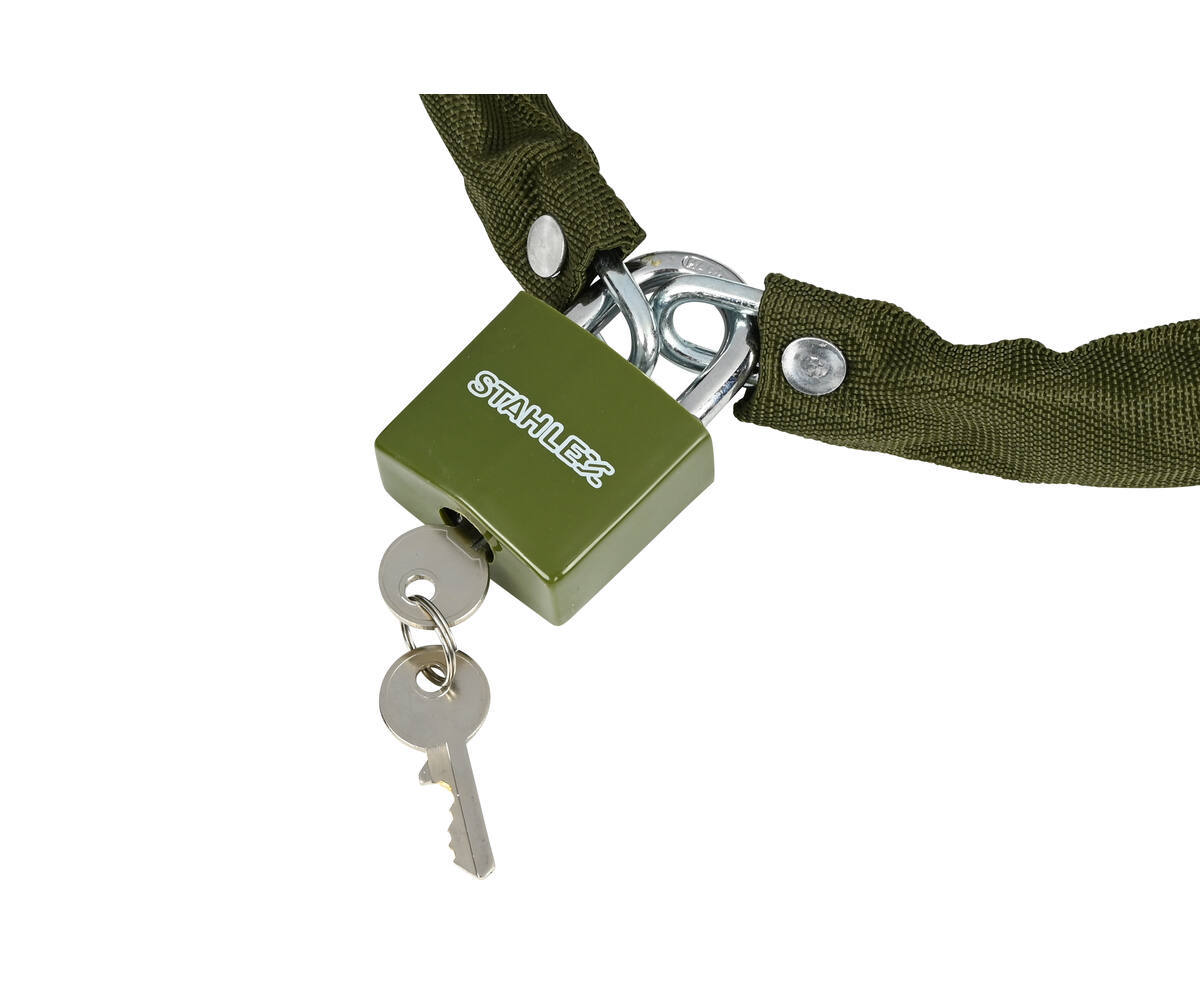 Die 5 mm starke Kette ist aus gehärtetem Stahl gefertigt und widersteht gängigen Aufbruchversuchen. Zwei mitgelieferte Schlüssel ermöglichen eine einfache und sichere Handhabung.