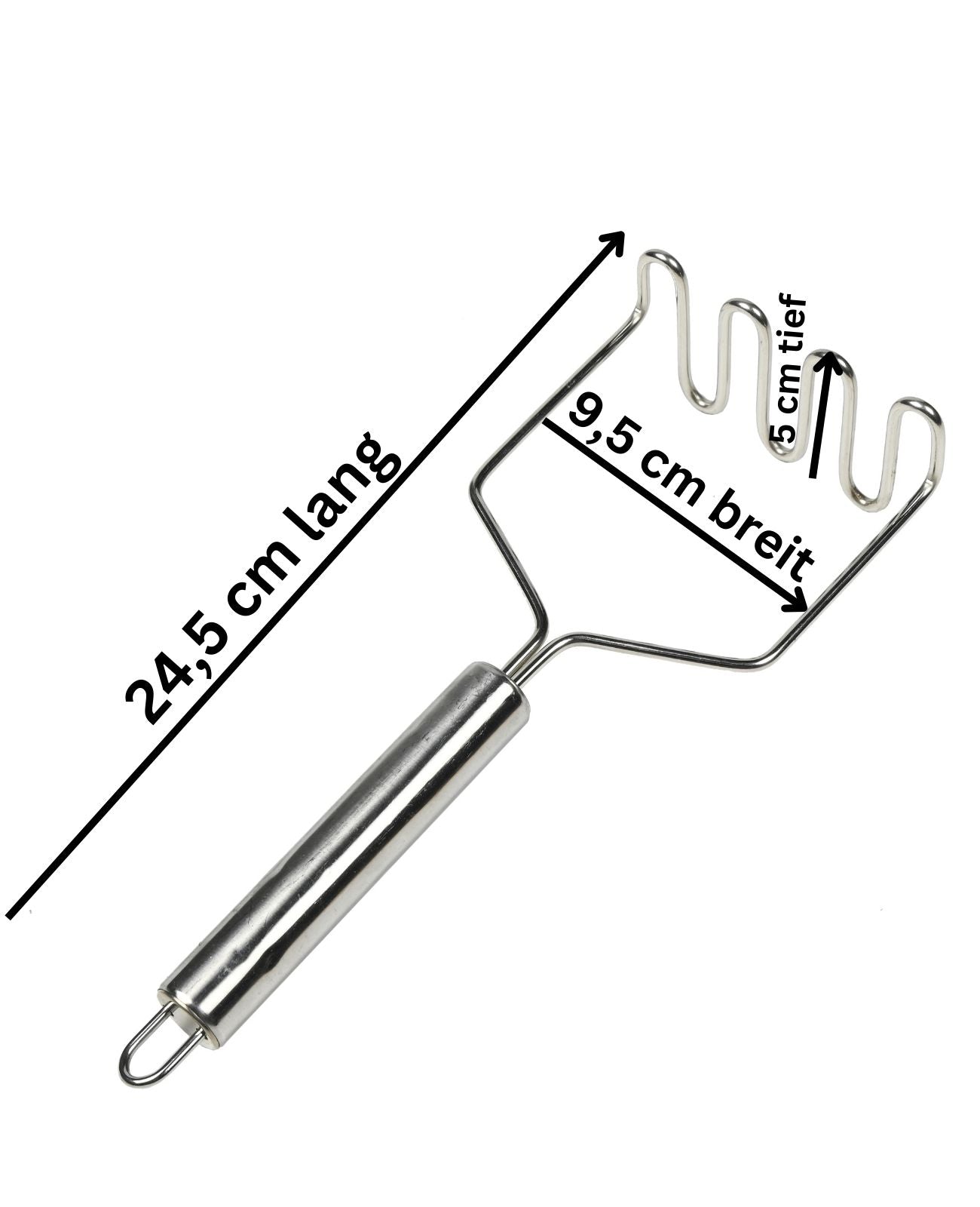 Mit diesem hochwertigen Küchenstampfer pürierst oder stampfst Du mühelos gekochte Kartoffeln, Gemüse oder Obst wie Apfelmus. Mit einer Länge von 24,5 cm und einer Pressebreite von 9,5 cm liegt er sicher und bequem in der Hand.