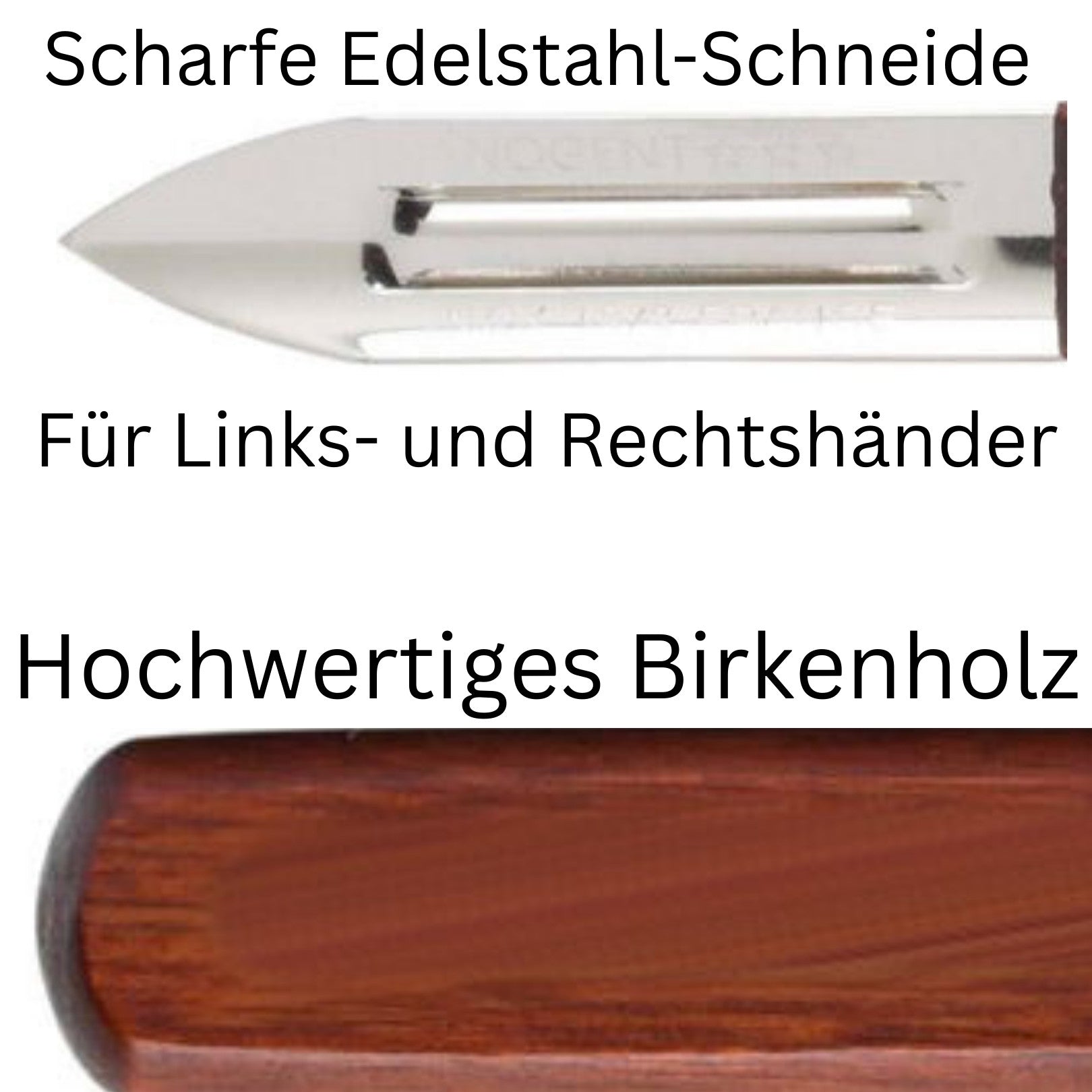 Gefertigt aus rostfreiem Edelstahl, natürlichem Birkenholz und stabilen Aluminiumgriffen ist der Schäler langlebig, pflegeleicht und ergonomisch. Ein eingebauter Pitter hilft beim Entfernen von Schadstellen.