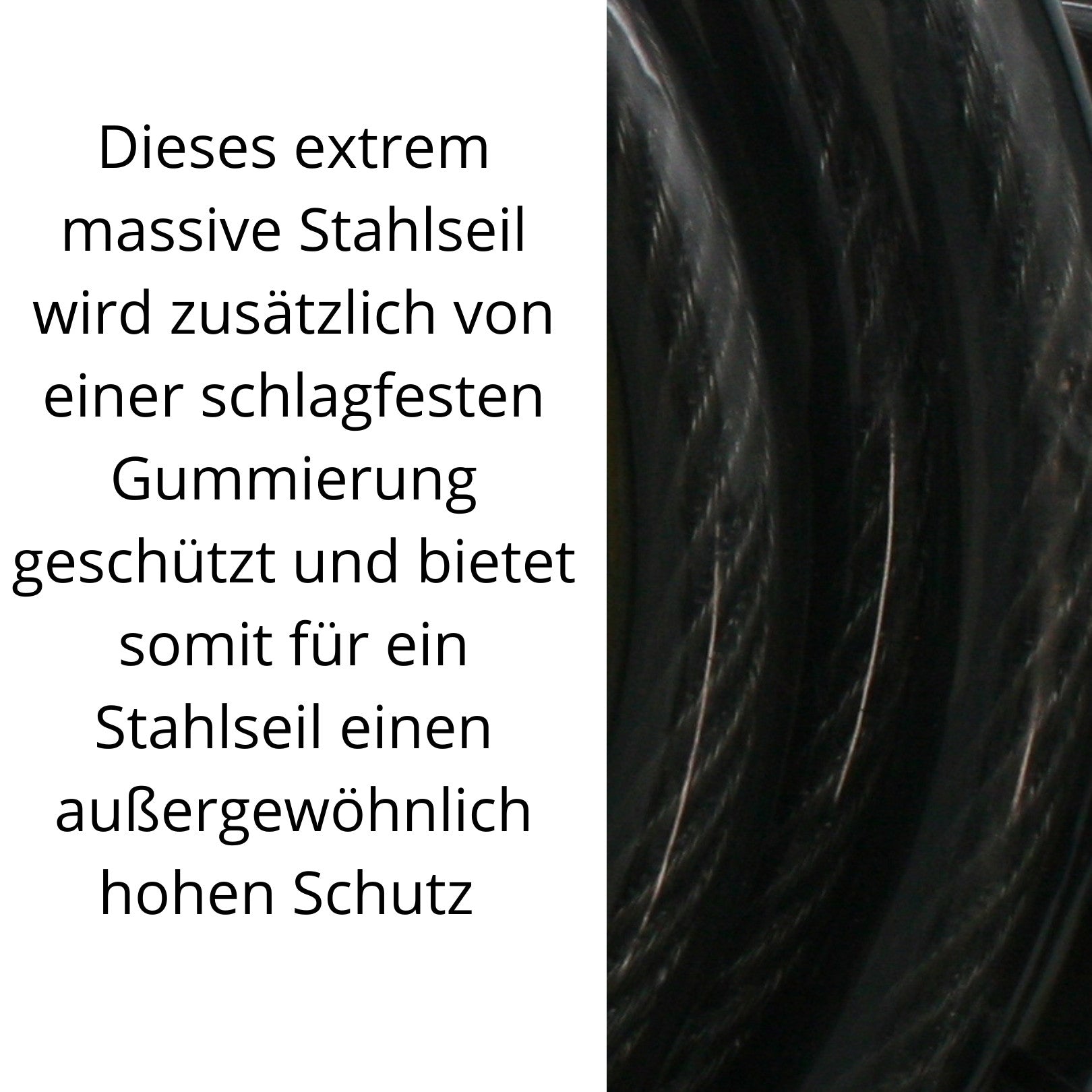 Das Stahlseil aus robustem Stahl mit 20 mm Durchmesser ist zusätzlich mit einer grauen, widerstandsfähigen Gummierung ummantelt. Diese schützt vor Korrosion und sorgt für eine lange Lebensdauer, auch bei Wind und Wetter. Die Gummierung verhindert außerdem Kratzer an deinen Wertsachen.