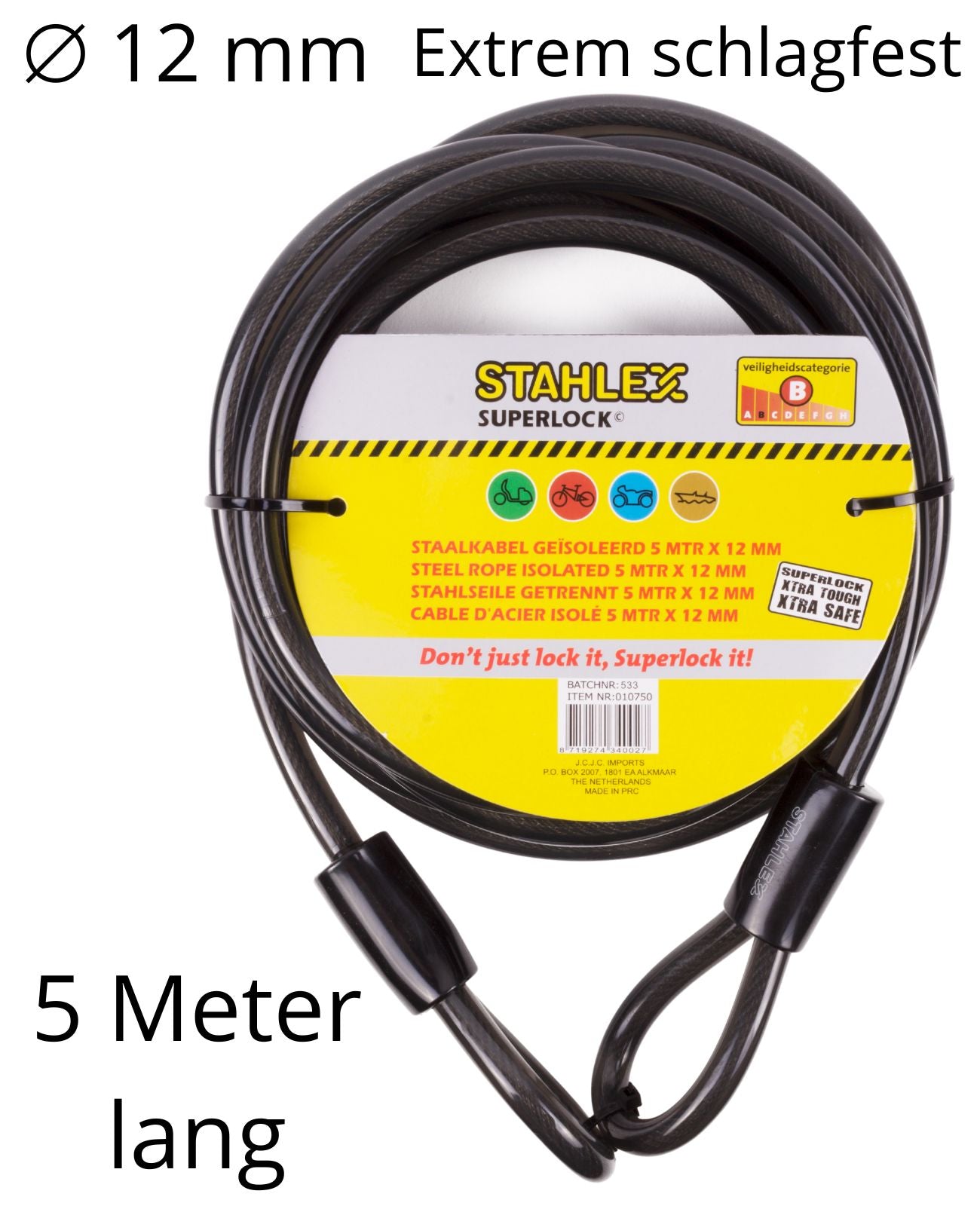 Dieses extra starke Sicherheitskabel mit Ösen, 5 Meter lang und Ø 12 mm dick, bietet dir maximale Sicherheit und Flexibilität. Eine langlebige Lösung zum Schutz deiner Wertgegenstände – auch unter härtesten Bedingungen.